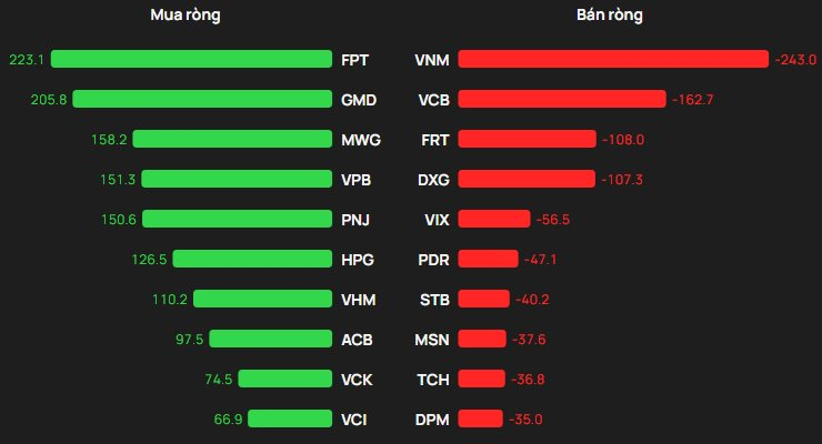 Ở chiều mua, khối ngoại mua ròng mạnh nhất cổ phiếu FPT với giá trị khoảng 223 tỷ đồng, theo sau là GMD (206 tỷ), MWG (158 tỷ), VPB (151 tỷ) và PNJ (151 tỷ đồng). Các mã khác cũng được mua ròng đáng chú ý gồm HPG (127 tỷ) và VHM (xấp xỉ 110 tỷ đồng).