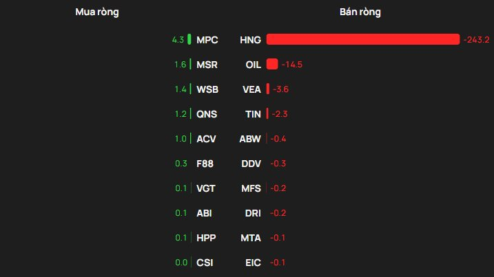 Ở chiều ngược lại, HNG bị bán ròng áp đảo với giá trị lên tới khoảng 243 tỷ đồng, trong khi các mã còn lại chỉ ghi nhận mức bán ròng không đáng kể, phổ biến dưới 4 tỷ đồng (ngoại trừ OIL bị bán 15 tỷ).