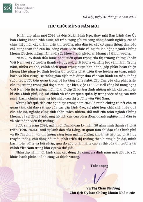 Nhân dịp năm mới 2026 và đón Xuân Bính Ngọ, Chủ tịch UBCKNN Vũ Thị Chân Phương đã gửi tới cộng đồng doanh nghiệp, các tổ chức hiệp hội, các thành viên thị trường, nhà đầu tư, các cơ quan thông tấn, báo chí, cùng toàn thể cán bộ, công chức, viên chức và người lao động ngành Chứng khoán lời chúc mừng năm mới sức khỏe, hạnh phúc, an khang và thịnh vượng.